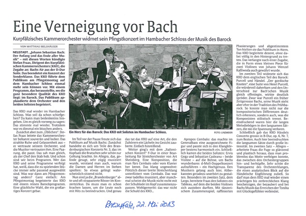 Das Konzertprogramm hatte übrigens Konzept. Dafür hatte der Dirigent Stefan Fraas gesorgt. Zwischen Mozart, Beethoven und Johann Sebastian Bachs Sohn Johann Christian gibt es Zusammenhänge. Vater Bach lehrte den achtjährigen Mozart wie man Klavierkonzerte strukturiert, und Beethoven komponierte für Mozarts d-Moll-Konzert eine geniale Kadenz. Bachs vorklassische Sinfonia spielte das Orchester auf hohem Niveau, inspiriert und fetzig. […] Besonders schön waren die Töne der Flöten und der ersten Geiger. Und bei Beethovens selten gespielter zweiten Sinfonie D-Dur op. 36 hatte man den Eindruck, ein homogenes und immerzu mit Herz und Sehnsucht spielendes Sinfonieorchester zu hören. […] Der Konzertabend war ein großes Ereignis und eine Einladung für die weiteren Abonnement-Konzerte der Saison.